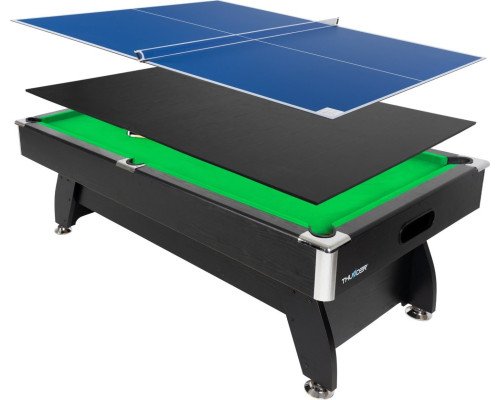 Більярдний стіл BOLD-BLACK-9FT-PING-JAD від THUNDER пропонує достатньо місця для гри в більярд, настільний теніс або аерохокей. Крім того, він також має практичне застосування як велика площа для гри в настільні ігри.