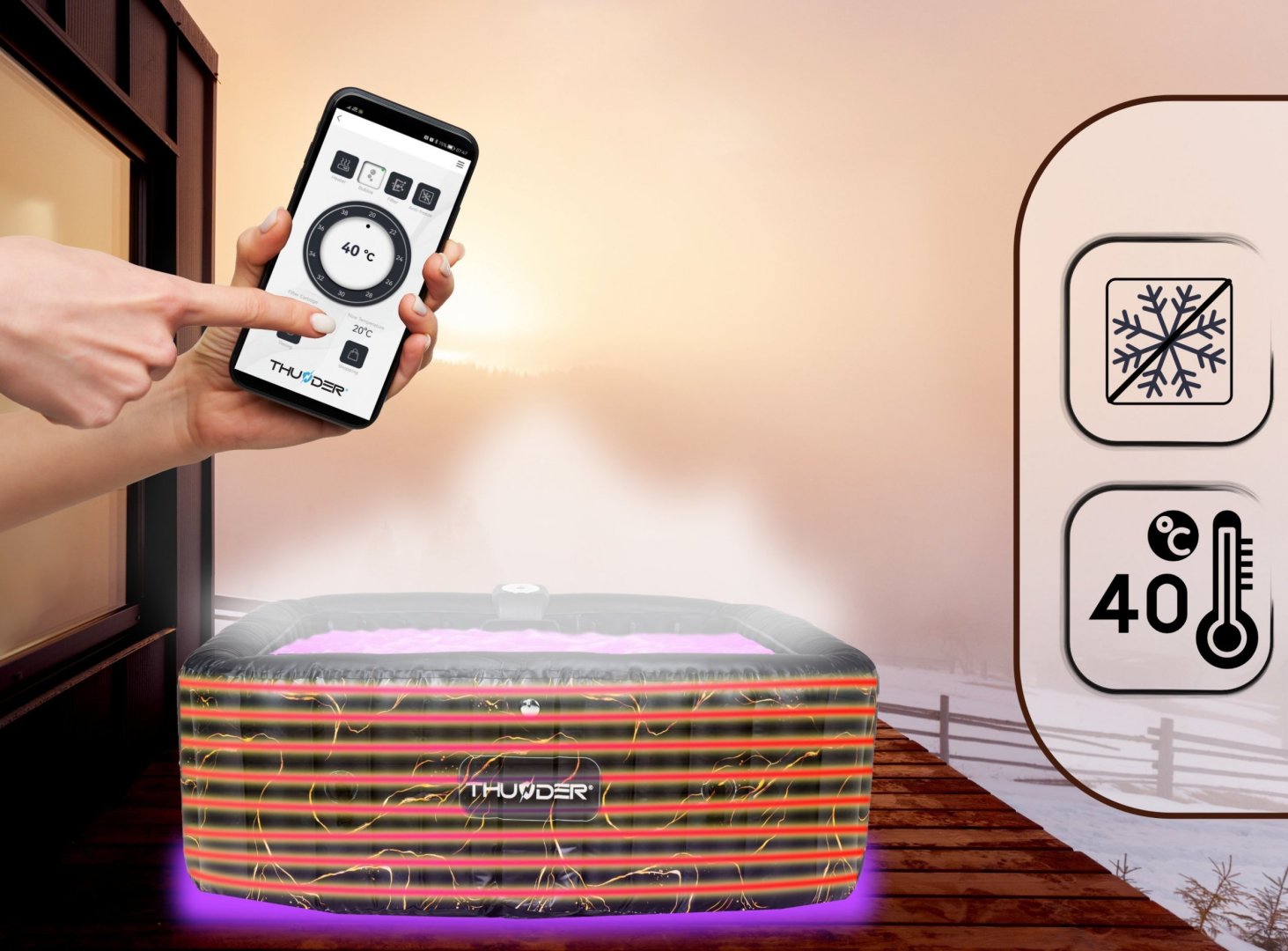 Дистанційне керування через мобільний додаток – одна з переваг надувного джакузі THUNDER®️ BLEND. Завдяки спеціально розробленому додатку користувачі можуть зручно контролювати та регулювати налаштування. Переваги цього рішення численні. По-перше, це забезпечує комфорт і зручність використання. Вам не потрібно вставати, щоб налаштувати параметри води під свої потреби! Крім того, дистанційне керування дозволяє користувачам готувати джакузі заздалегідь. Ви можете дистанційно ввімкнути підігрів води або гідромасаж перед входом у нього, щоб насолоджуватися готовим і ідеально підготовленим басейном. Крім того, дистанційне керування дозволяє відстежувати стан надувного SPA , наприклад температуру води та рівень чистоти, що дозволяє користувачам належним чином підтримувати та обслуговувати пристрій. Завдяки цьому рішенню надувний SPA THUNDER®️ BLEND стає ще більш функціональним і адаптованим до потреб користувачів.