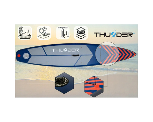 SUP дошка від THUNDER виготовлена із високоякісних матеріалів. Конструкція міцна та стабільна завдяки внутрішній структурі, виконаній за технологією Ultra Light Drop Stich Core, що посилює стінки виробу тисячами волокон, надаючи йому жорсткості. Композитне покриття UAL з товстим ПВХ шаром, посилене скловолокном та додатково покрите 5 мм шаром піни EVA з м'якою, зручною та протиковзною текстурою, що забезпечує виняткове зчеплення. На передній частині борту розташований багажник, що дозволяє з легкістю закріпити все необхідне або зафіксувати весло під час швартування.