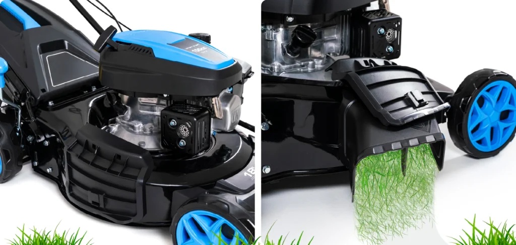 - 9 функцій в 1 - косіння, збір, мульчування, боковий викид, регулювання висоти зрізу, легкий запуск, порт для миття, привід, індикатор заповнення.